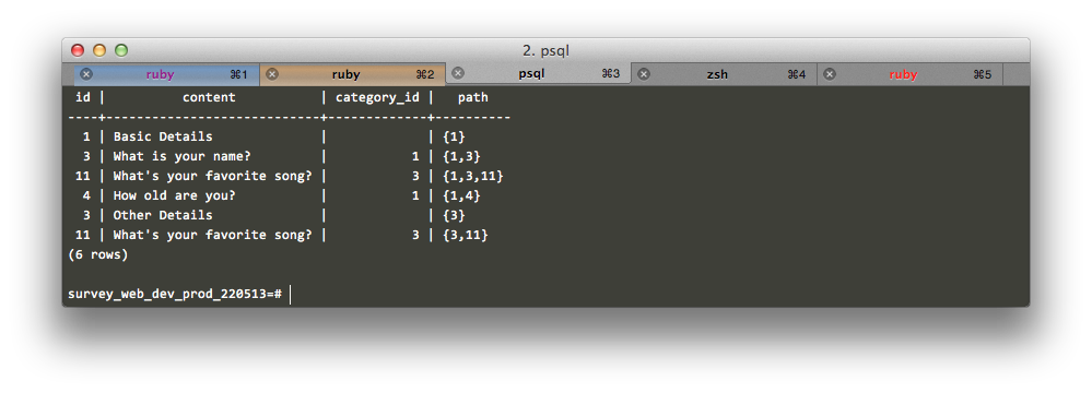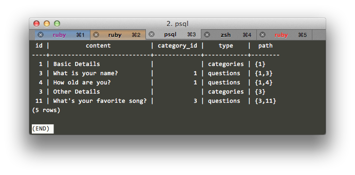 But wait. The recursive term is only fetching questions. What if the child of a first-level category is a category? Postgres doesn’t let us reference the non-recursive term more than once. So doing a UNION of categories and questions is out. We have to be a little creative here: