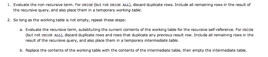 Now on to the recursive term. According to the Postgres docs: